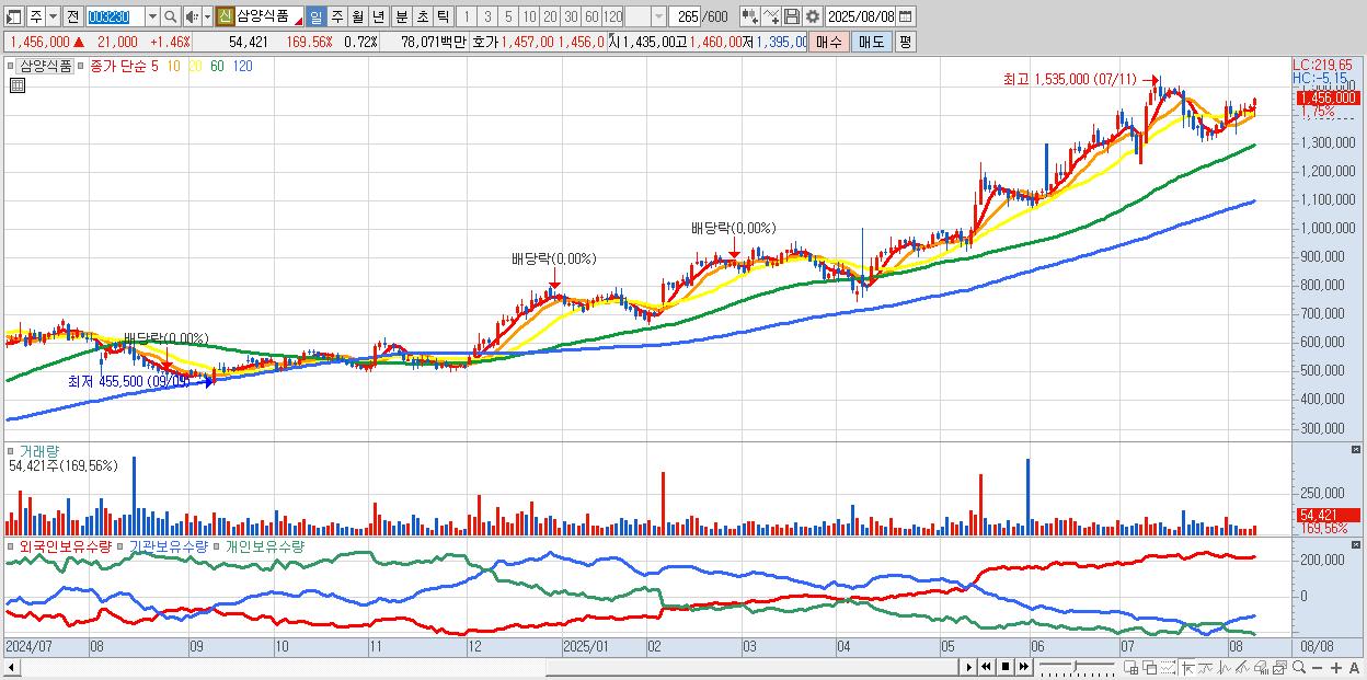 - 삼양식품 (1,455,000원 ▲ 1.39% , 시총: 109,605억, 외국인 순매수 거래금:85억)