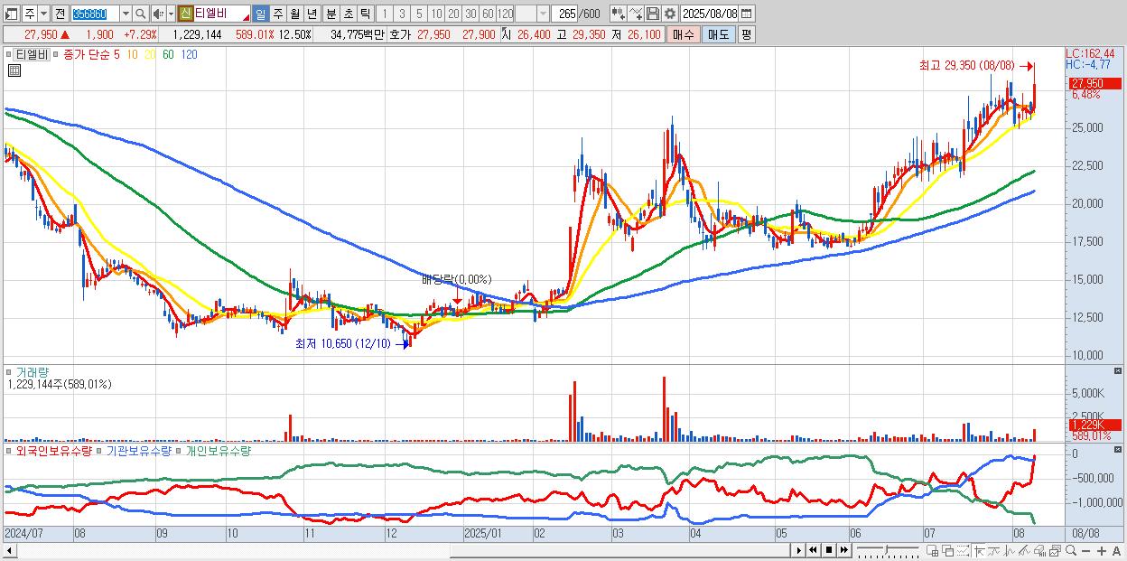- 티엘비 (28,150원 ▲ 8.06% , 시총: 2,768억, 외국인 순매수 거래금:61억)