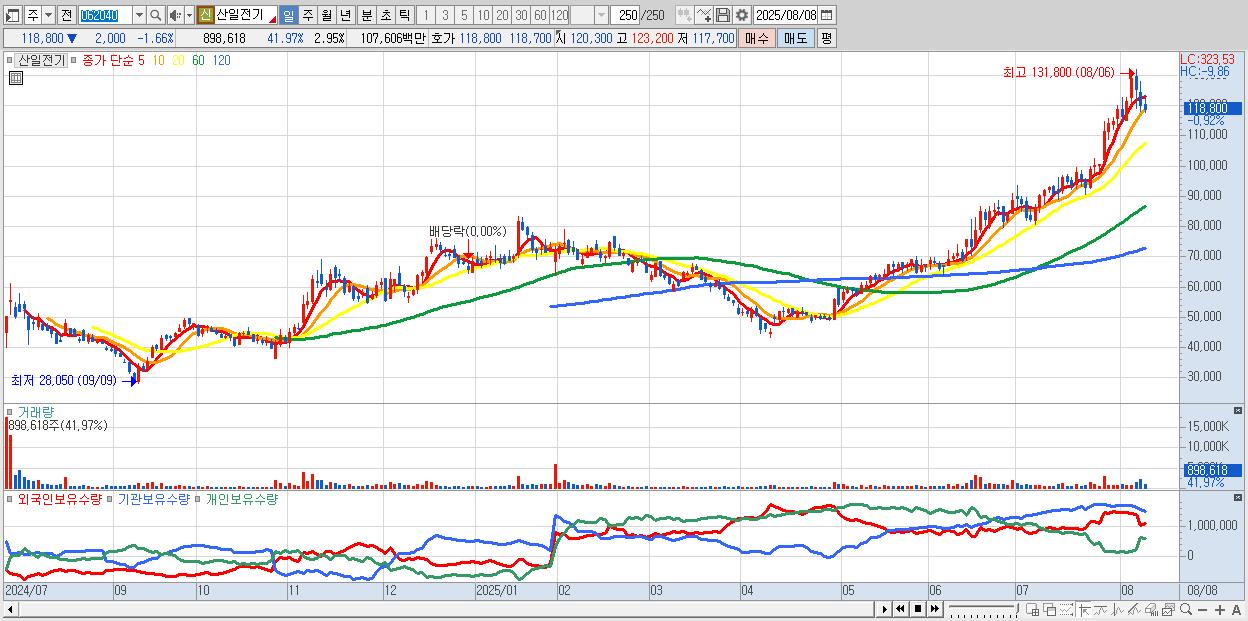 - 산일전기 (119,200원 ▼ -1.32% , 시총: 36,291억, 외국인 순매수 거래금:77억)