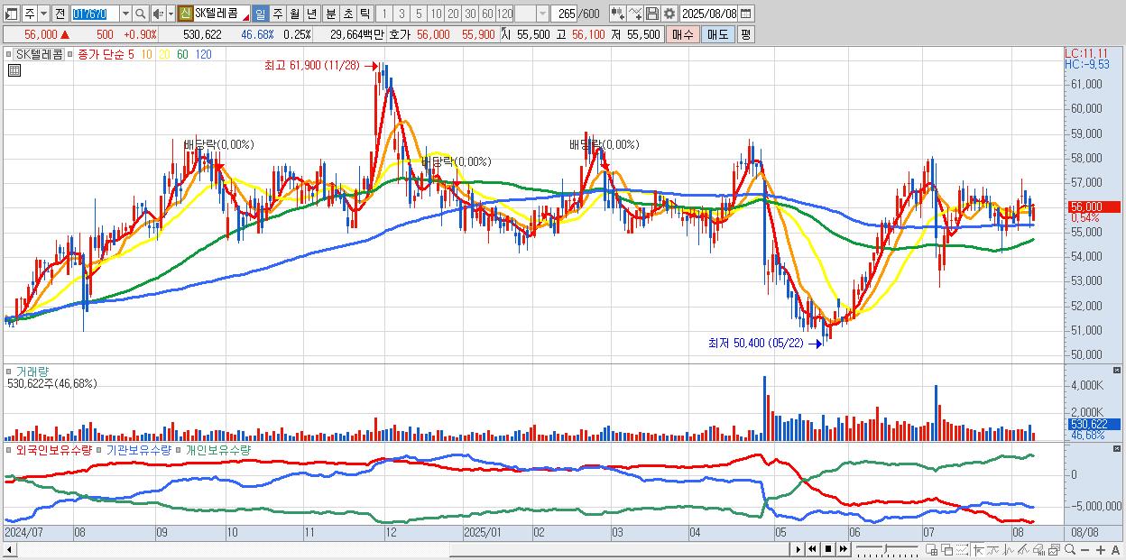 - SK텔레콤 (56,100원 ▲ 1.08% , 시총: 120,497억, 외국인 순매수 거래금:69억)