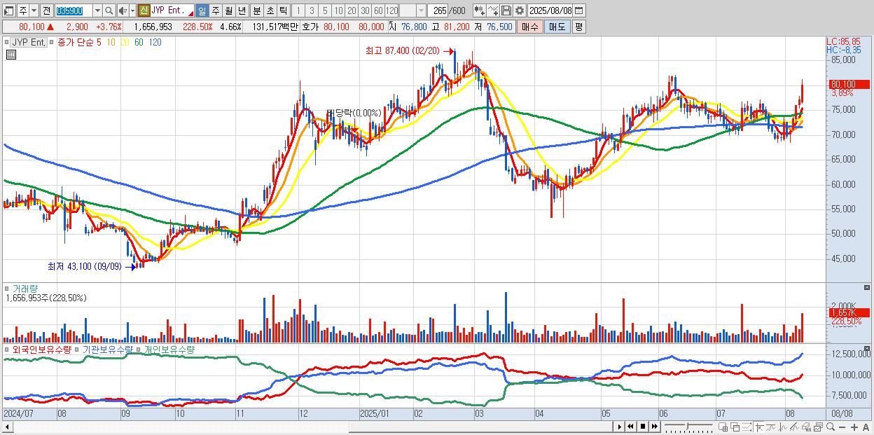 - JYP Ent. (79,800원 ▲ 3.37% , 시총: 28,355억, 외국인 순매수 거래금:198억)