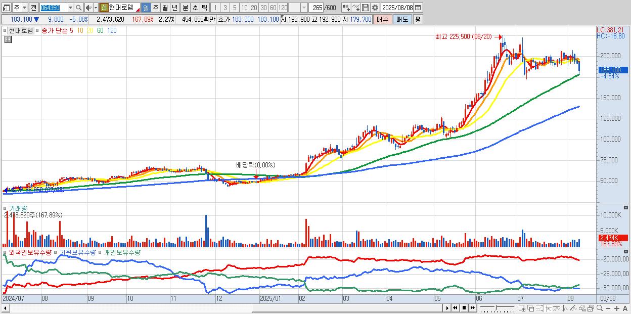 - 현대로템 (183,500원 ▼ -4.87% , 시총: 200,276억, 거래량: 1,521,033, 거래대금:2,791억)