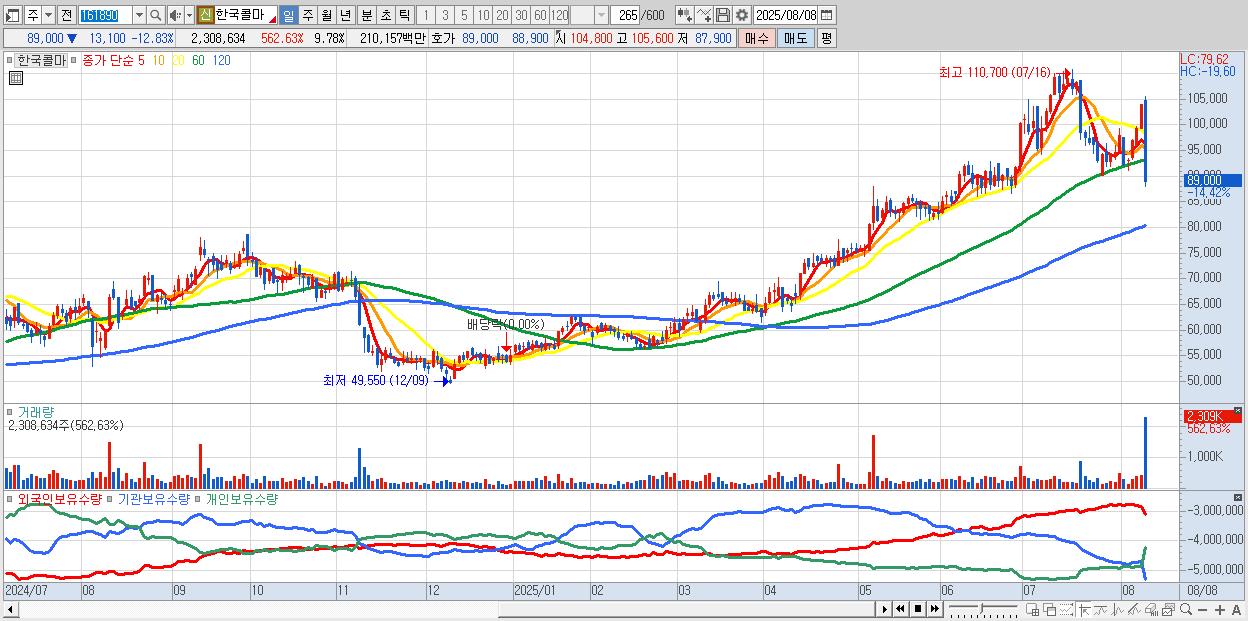 - 한국콜마 (88,900원 ▼ -12.93% , 시총: 20,985억, 거래량: 1,477,137, 거래대금:1,340억)