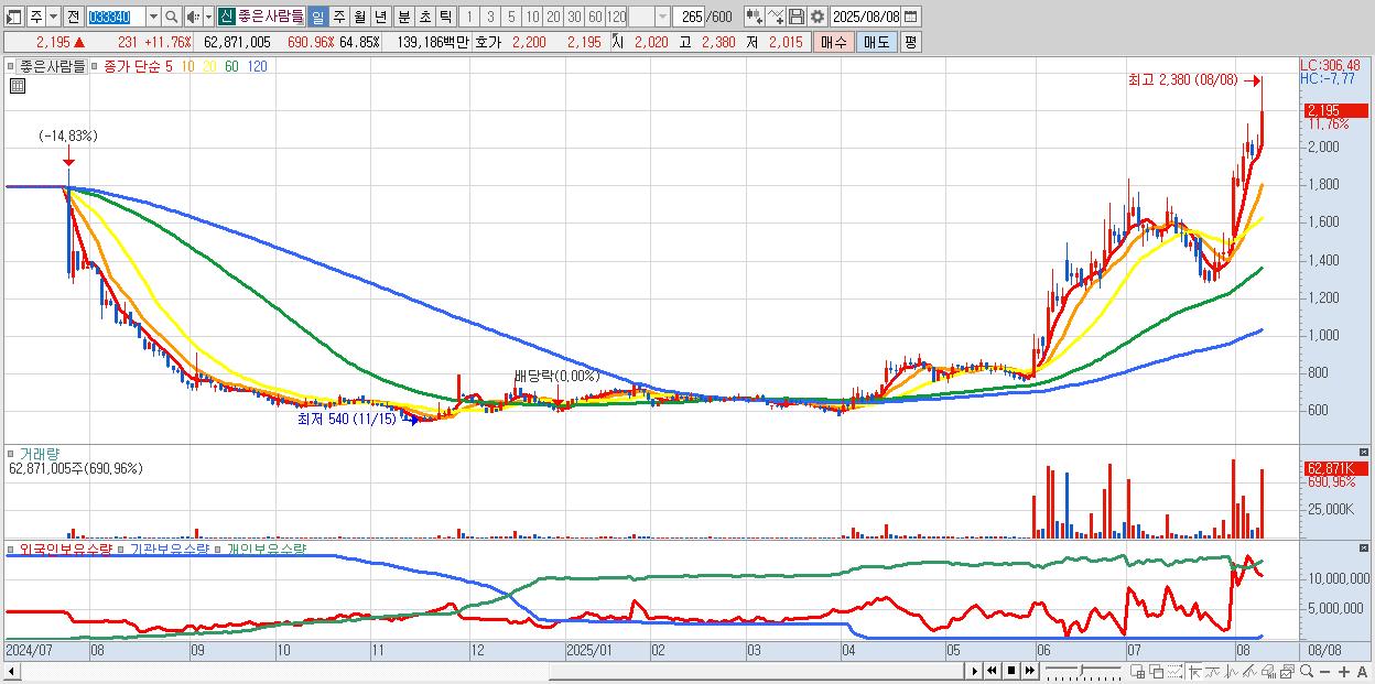 - 좋은사람들 (2,195원 ▲ 11.76% , 시총: 2,128억, 거래량: 62,871,005, 거래대금:1,392억)