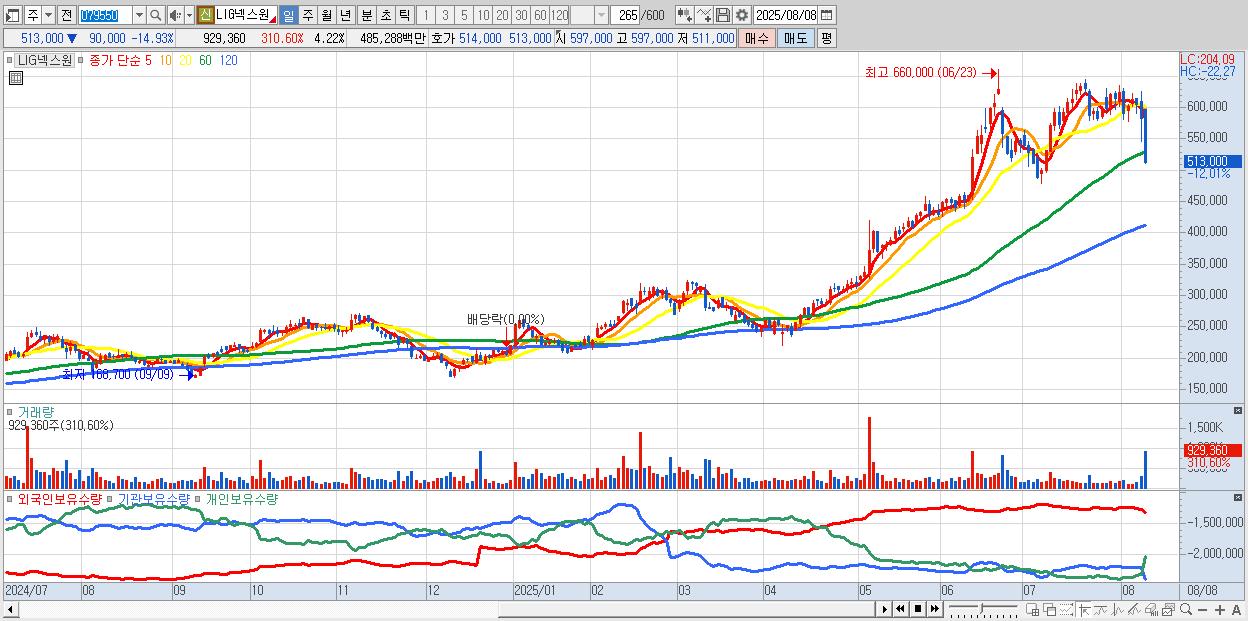 - LIG넥스원 (513,000원 ▼ -14.93% , 시총: 112,860억, 거래량: 674,003, 거래대금:3,504억)