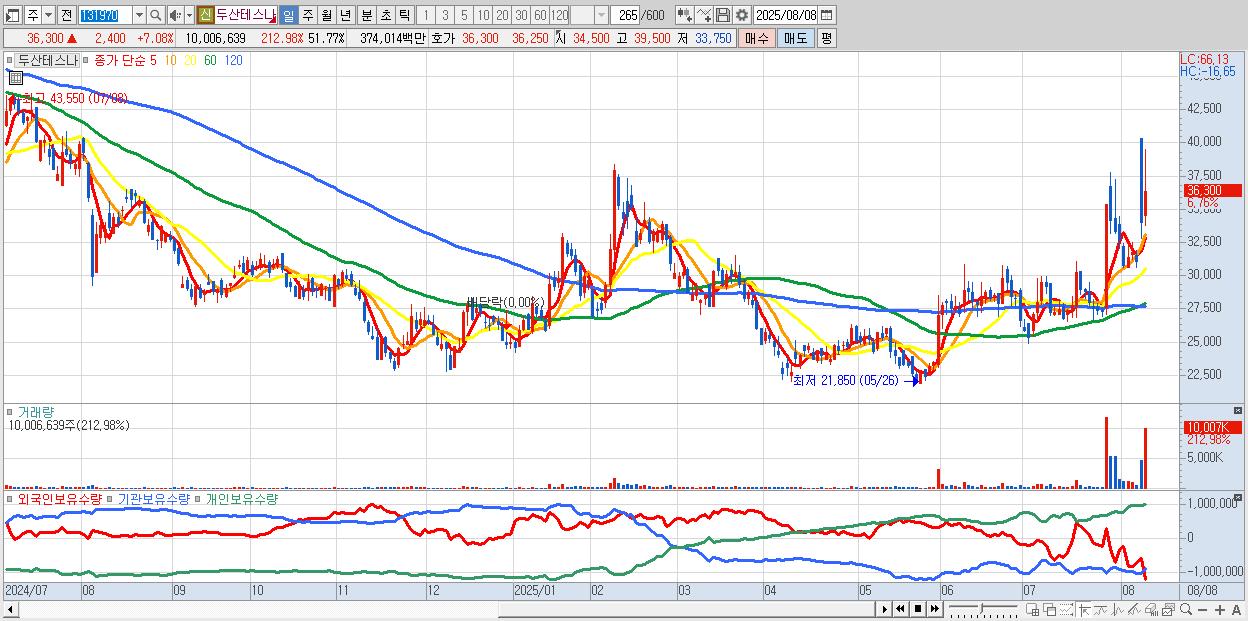 - 두산테스나 (36,650원 ▲ 8.11% , 시총: 7,083억, 거래량: 4,644,852, 거래대금:1,749억)