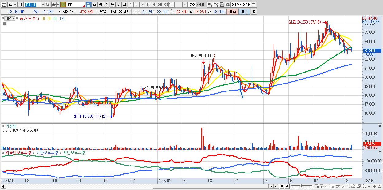 - HMM (23,000원 ▼ -0.86% , 시총: 235,759억, 거래량: 5,473,234, 거래대금:1,259억)