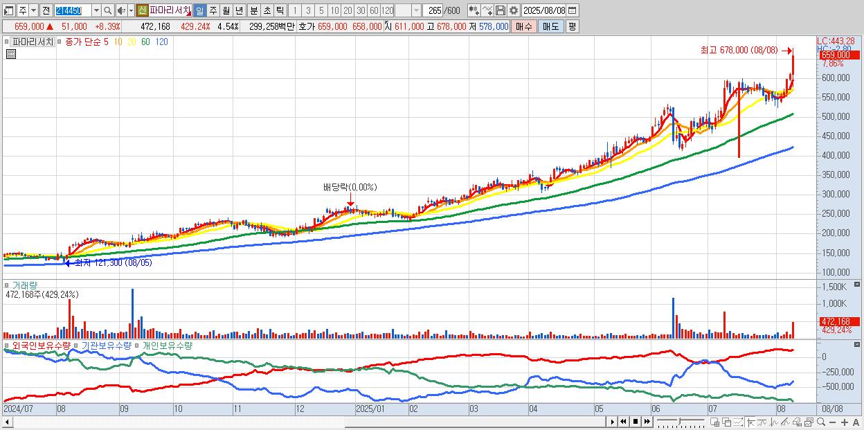 - 파마리서치 (664,000원 ▲ 9.21% , 시총: 68,987억, 거래량: 315,371, 거래대금:2,001억)