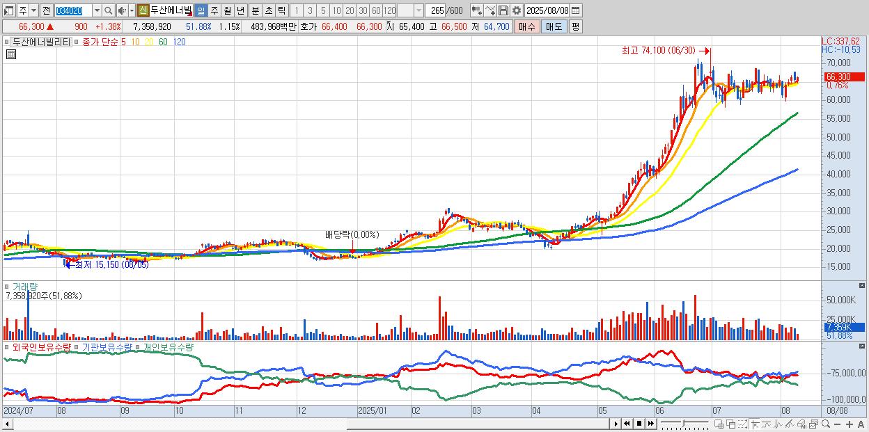 - 두산에너빌리티 (66,400원 ▲ 1.53% , 시총: 425,333억, 거래량: 3,430,734, 거래대금:2,256억)