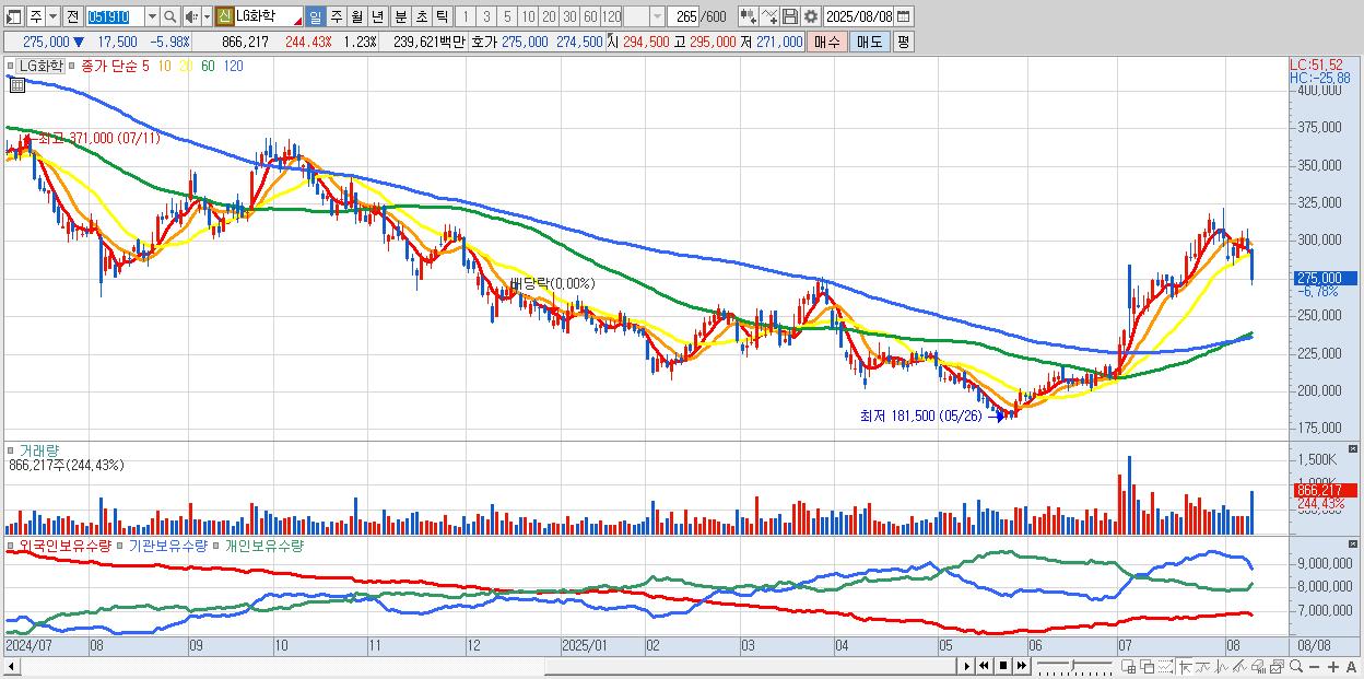 - LG화학 (276,500원 ▼ -5.47% , 시총: 195,188억, 거래량: 625,417, 거래대금:1,729억)