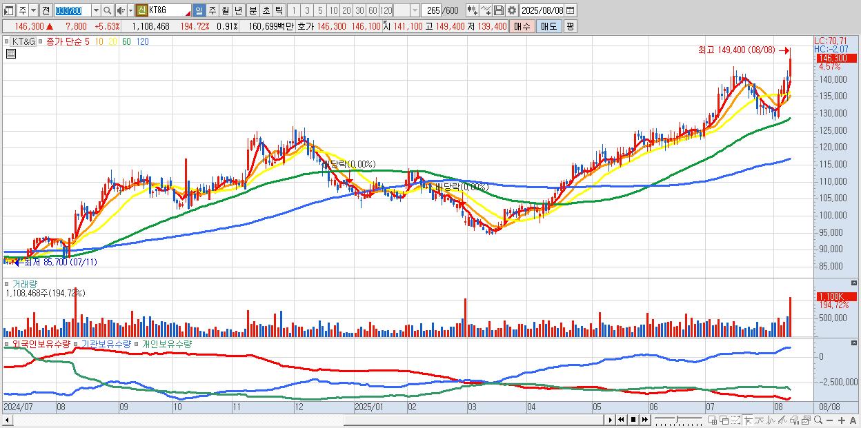 - KT&G (147,200원 ▲ 6.28% , 시총: 179,676억, 거래량: 956,482, 거래대금:1,387억)