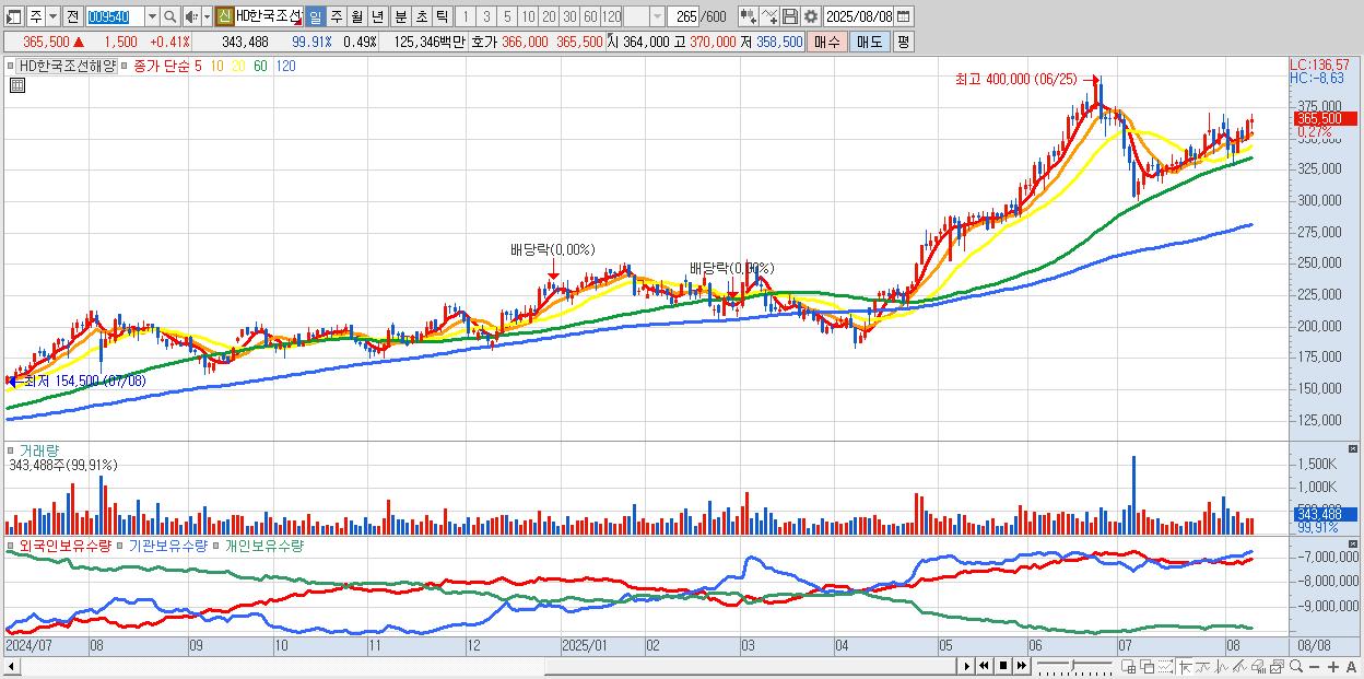 30.HD한국조선해양 365,000원 ▲ 0.27% (KOSPI, 009540)