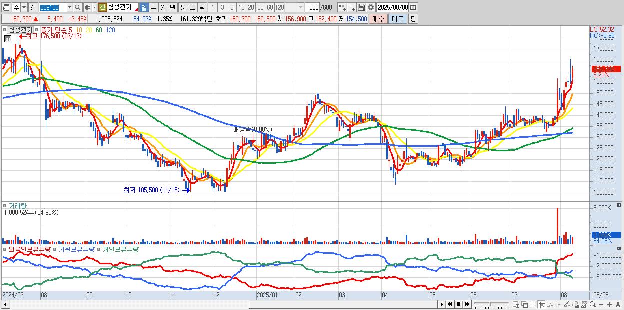 - 삼성전기 (160,100원 ▲ 3.09% , 시총: 119,585억, 거래량: 670,902, 거래대금:1,074억)