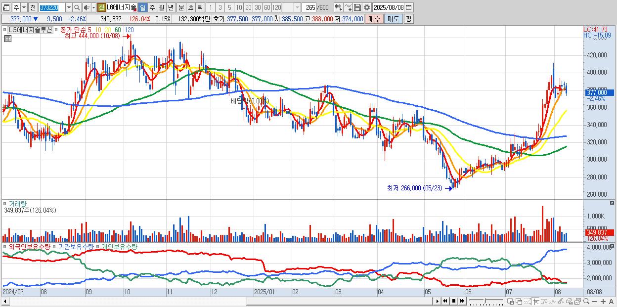 - LG에너지솔루션 (378,500원 ▼ -2.07% , 시총: 885,690억, 거래량: 268,294, 거래대금:1,014억)