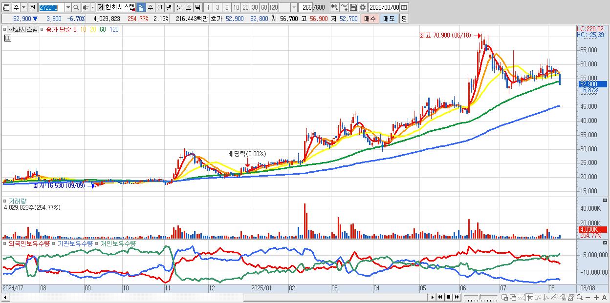 - 한화시스템 (52,800원 ▼ -6.88% , 시총: 99,749억, 거래량: 2,048,494, 거래대금:1,098억)