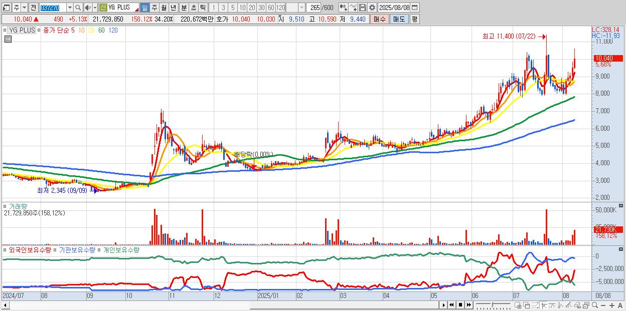 - YG PLUS (10,160원 ▲ 6.39% , 시총: 6,456억, 거래량: 11,544,378, 거래대금:1,173억)