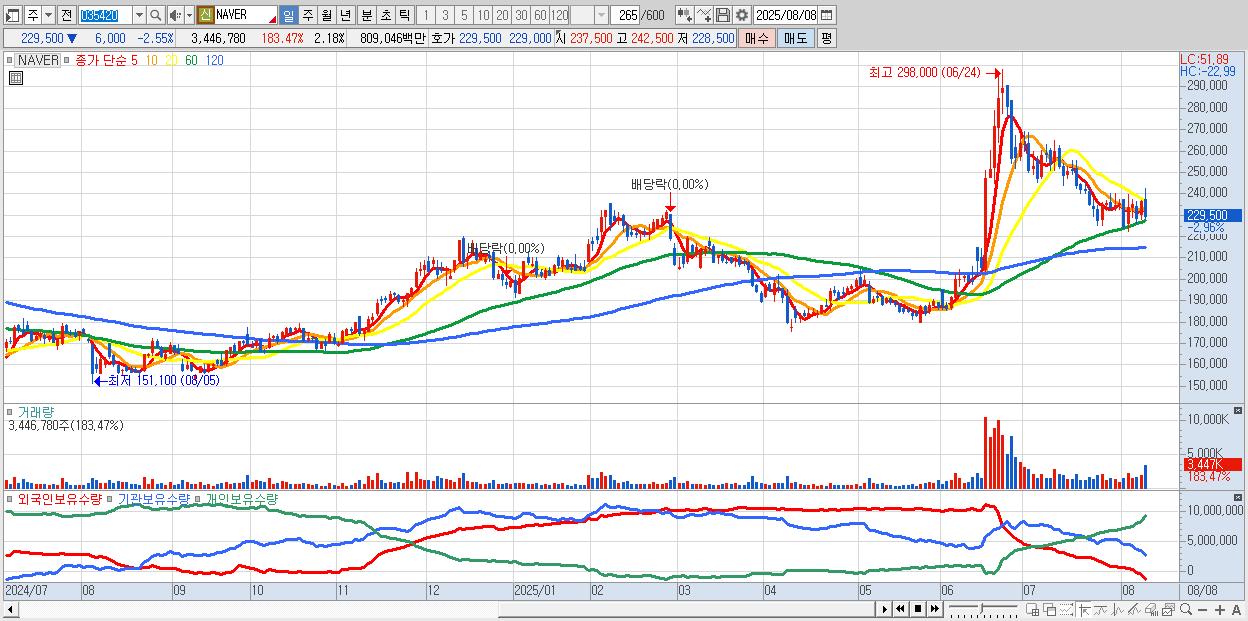 - NAVER (229,500원 ▼ -2.55% , 시총: 363,613억, 거래량: 1,638,049, 거래대금:3,826억)