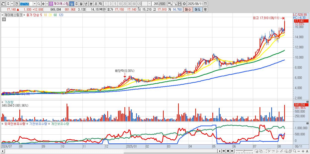 - 제이에스링크 (17,140원 ▲ 12.69% , 시총: 4,644억, 거래량: 849,094, 거래대금:142억, KOSDAQ)