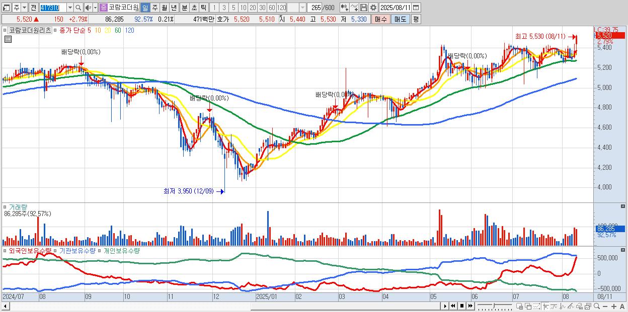 - 코람코더원리츠 (5,520원 ▲ 2.79% , 시총: 2,230억, 거래량: 86,285, 거래대금:5억, KOSPI)