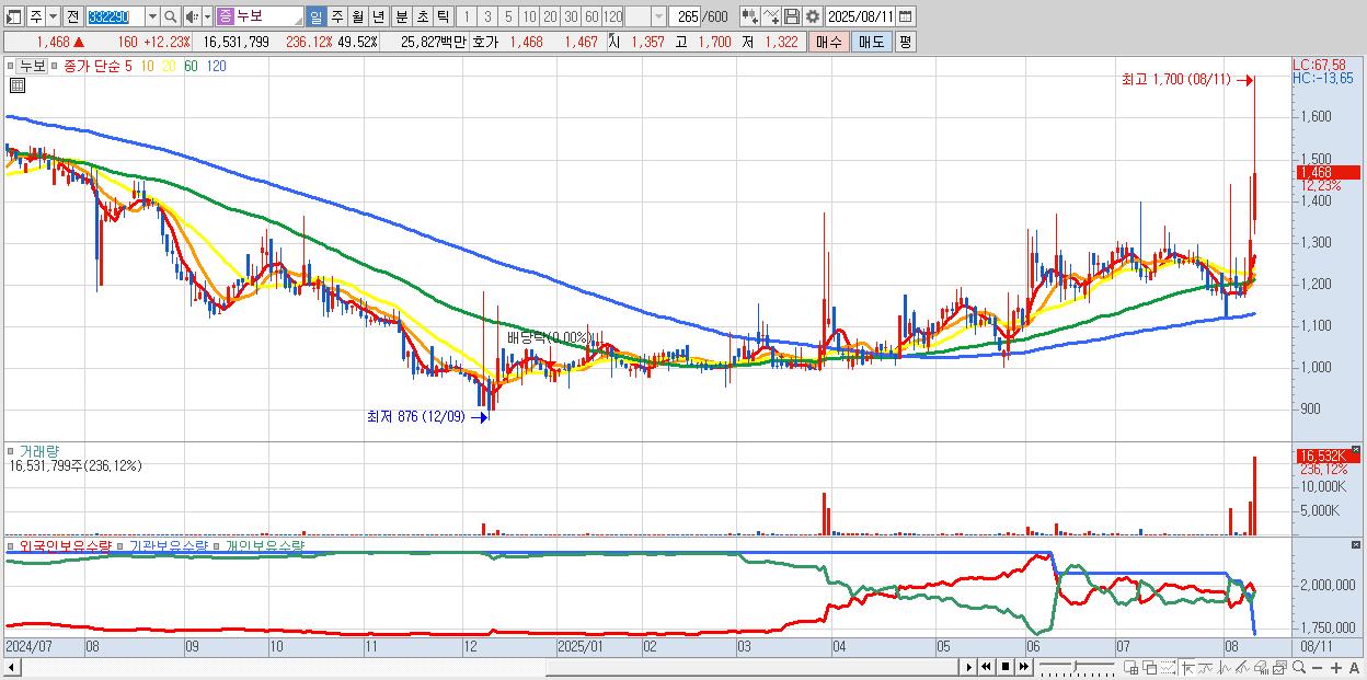 - 누보 (1,468원 ▲ 12.23% , 시총: 490억, 거래량: 16,531,799, 거래대금:258억, KOSDAQ)