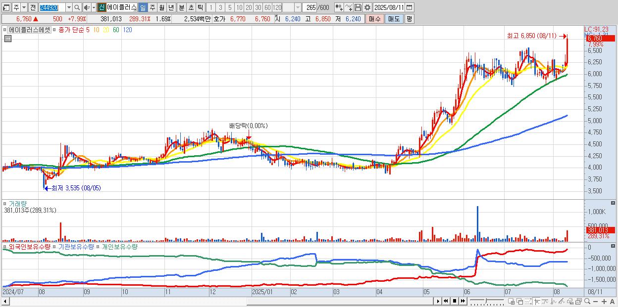 - 에이플러스에셋 (6,760원 ▲ 7.99% , 시총: 1,528억, 거래량: 381,013, 거래대금:25억, KOSPI)
