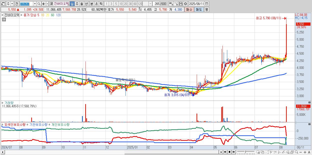 진바이오텍 5,550원 ▲ 24.58% (KOSDAQ, 086060)