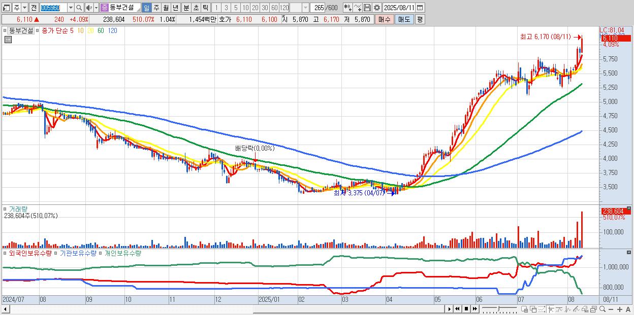 - 동부건설 (6,110원 ▲ 4.09% , 시총: 1,402억, 거래량: 238,604, 거래대금:15억, KOSPI)