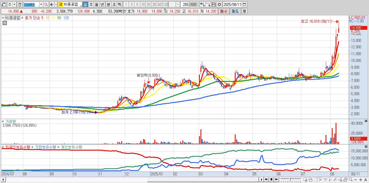 - HJ중공업 (14,890원 ▲ 6.28% , 시총: 12,400억, 거래량: 3,584,779, 거래대금:534억, KOSPI)