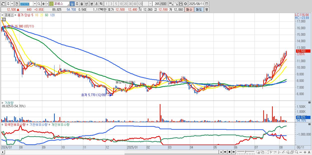 - 코세스 (12,500원 ▲ 3.65% , 시총: 2,073억, 거래량: 89,825, 거래대금:11억, KOSDAQ)