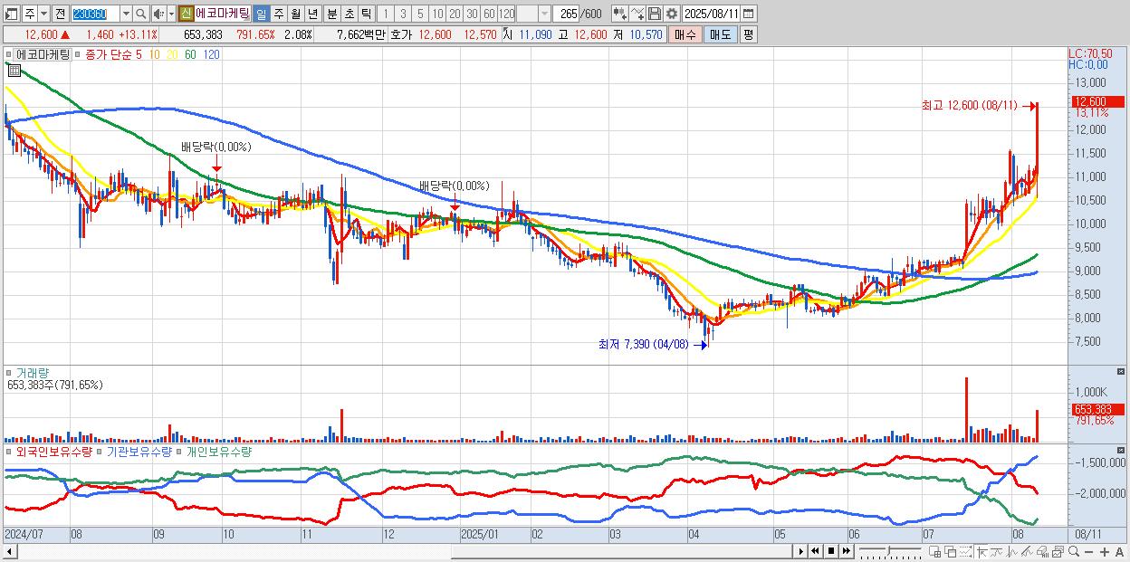 - 에코마케팅 (12,600원 ▲ 13.11% , 시총: 3,965억, 거래량: 653,383, 거래대금:77억, KOSDAQ)