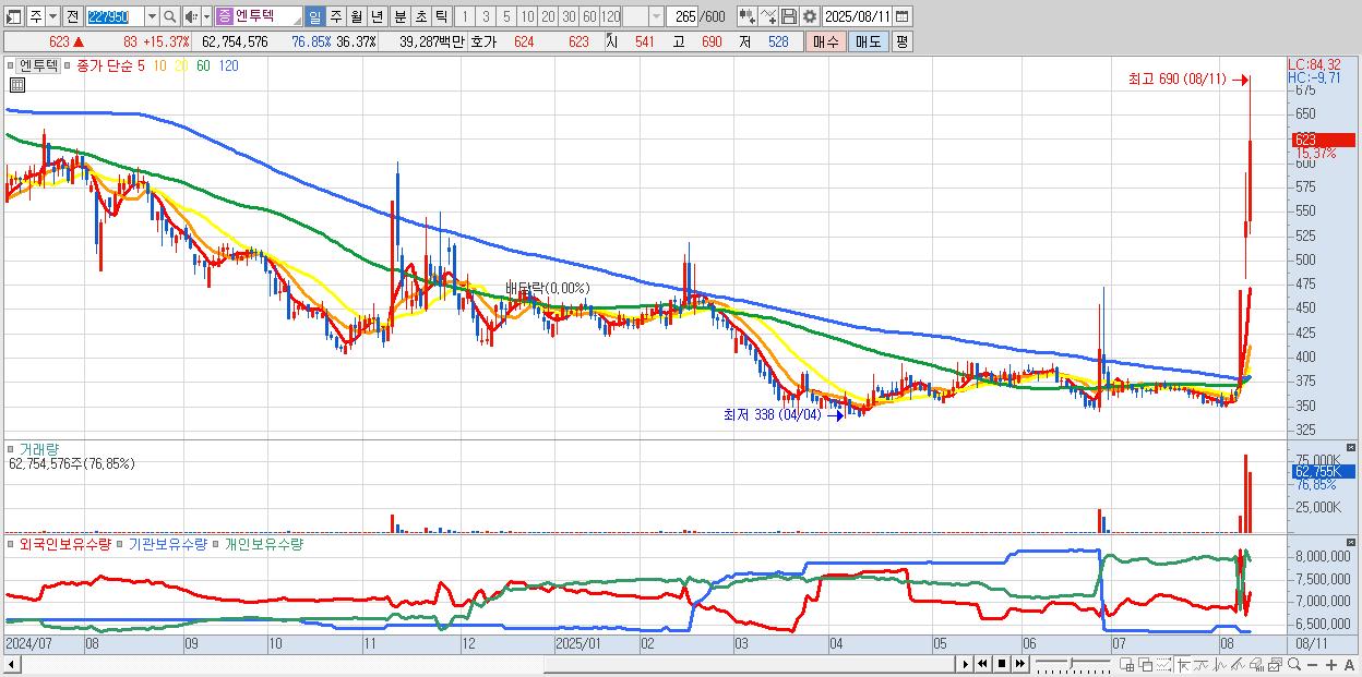 - 엔투텍 (623원 ▲ 15.37% , 시총: 1,075억, 거래량: 62,754,576, 거래대금:393억, KOSDAQ)