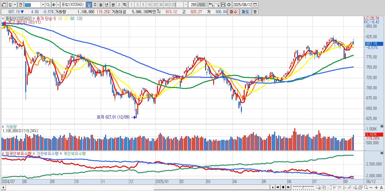 | 08/12 | 807.19 | ▼-0.57% | 152억 | -74억 | -31억 | -47억 |