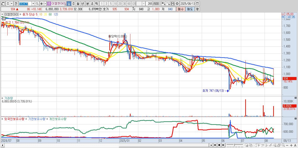 - 이엠앤아이 (934원 ▲ 10.14% , 시총: 199억, 거래량: 6,893,093, 거래대금:69억)