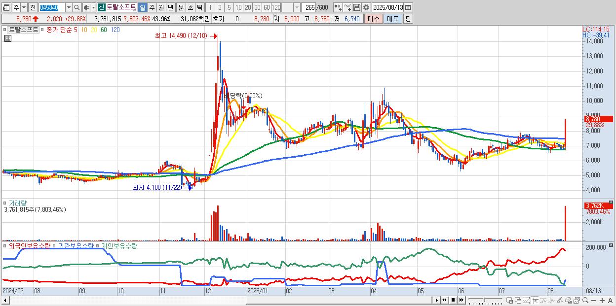 - 토탈소프트 (8,780원 ▲ 29.88% , 시총: 751억, 거래량: 3,761,815, 거래대금:311억)