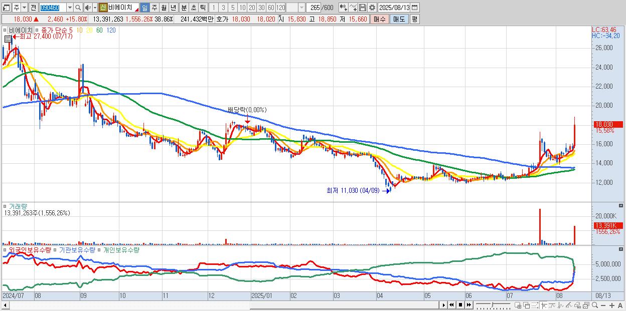 - 비에이치 (18,030원 ▲ 15.8% , 시총: 6,214억, 거래량: 7,990,189, 거래대금:1,439억)