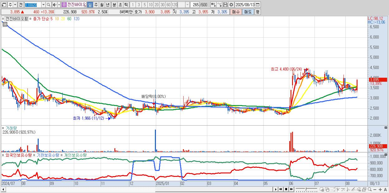 - 전진바이오팜 (3,895원 ▲ 13.39% , 시총: 353억, 거래량: 226,908, 거래대금:8억)