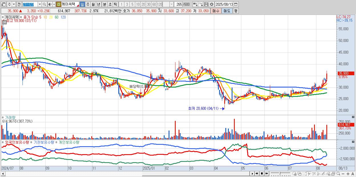 - 케이씨텍 (35,700원 ▲ 9.68% , 시총: 7,386억, 거래량: 331,986, 거래대금:117억)