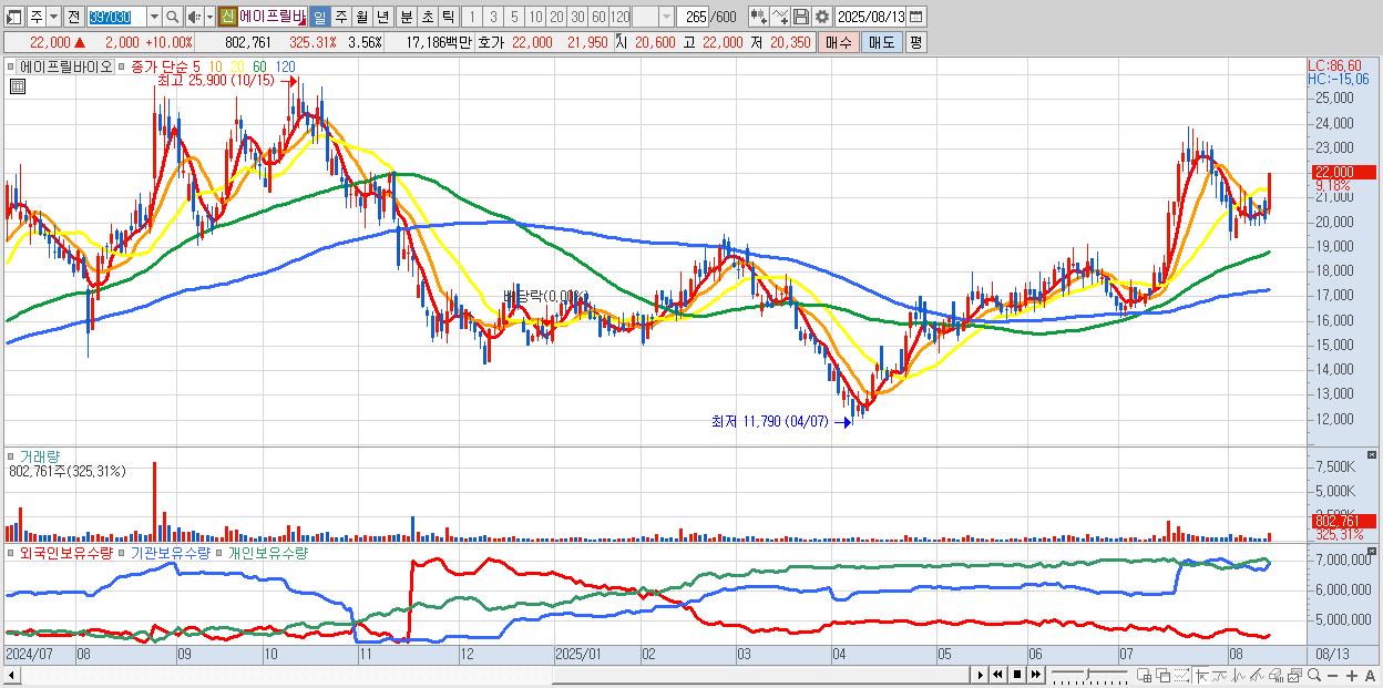 - 에이프릴바이오 (21,850원 ▲ 9.25% , 시총: 4,922억, 거래량: 453,801, 거래대금:97억)