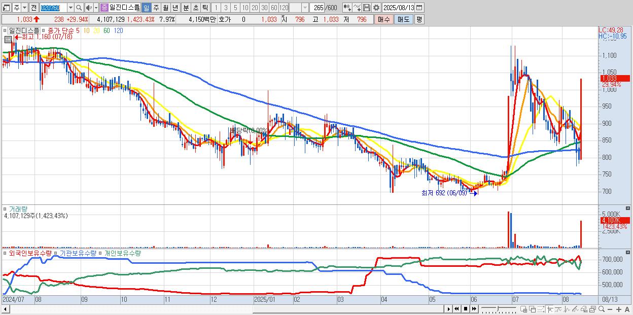 - 일진디스플 (1,033원 ▲ 29.94% , 시총: 532억, 거래량: 4,107,129, 거래대금:41억)
