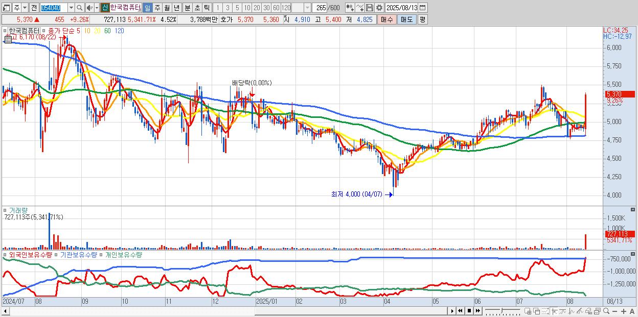 - 한국컴퓨터 (5,370원 ▲ 9.26% , 시총: 863억, 거래량: 727,113, 거래대금:38억)