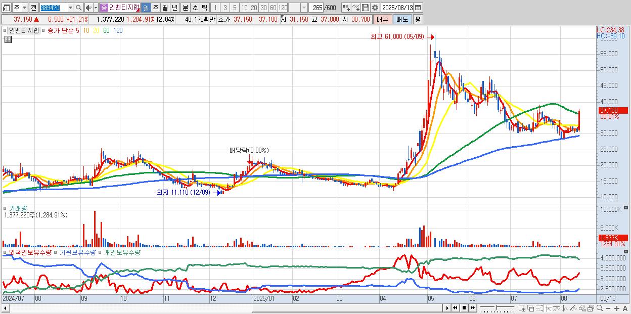 - 인벤티지랩 (34,800원 ▲ 13.54% , 시총: 3,734억, 거래량: 351,903, 거래대금:117억)