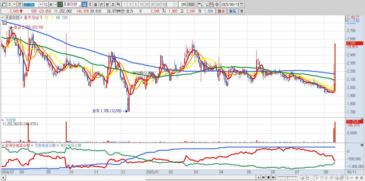 - 프로이천 (2,545원 ▲ 29.85% , 시총: 717억, 거래량: 11,252,002, 거래대금:266억)