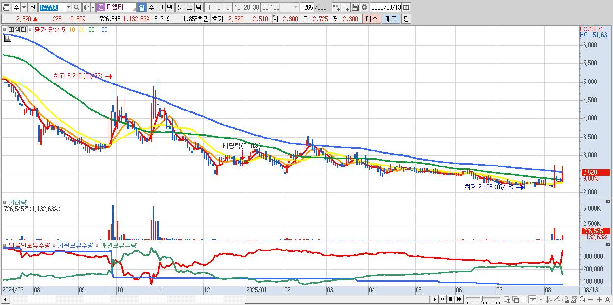 - 피엠티 (2,520원 ▲ 9.8% , 시총: 273억, 거래량: 726,545, 거래대금:19억)