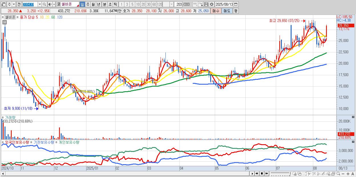 - 셀비온 (28,050원 ▲ 11.75% , 시총: 3,595억, 거래량: 275,120, 거래대금:74억)