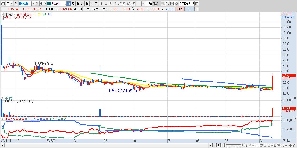 - 에스켐 (6,150원 ▲ 26.15% , 시총: 488억, 거래량: 4,860,016, 거래대금:289억)