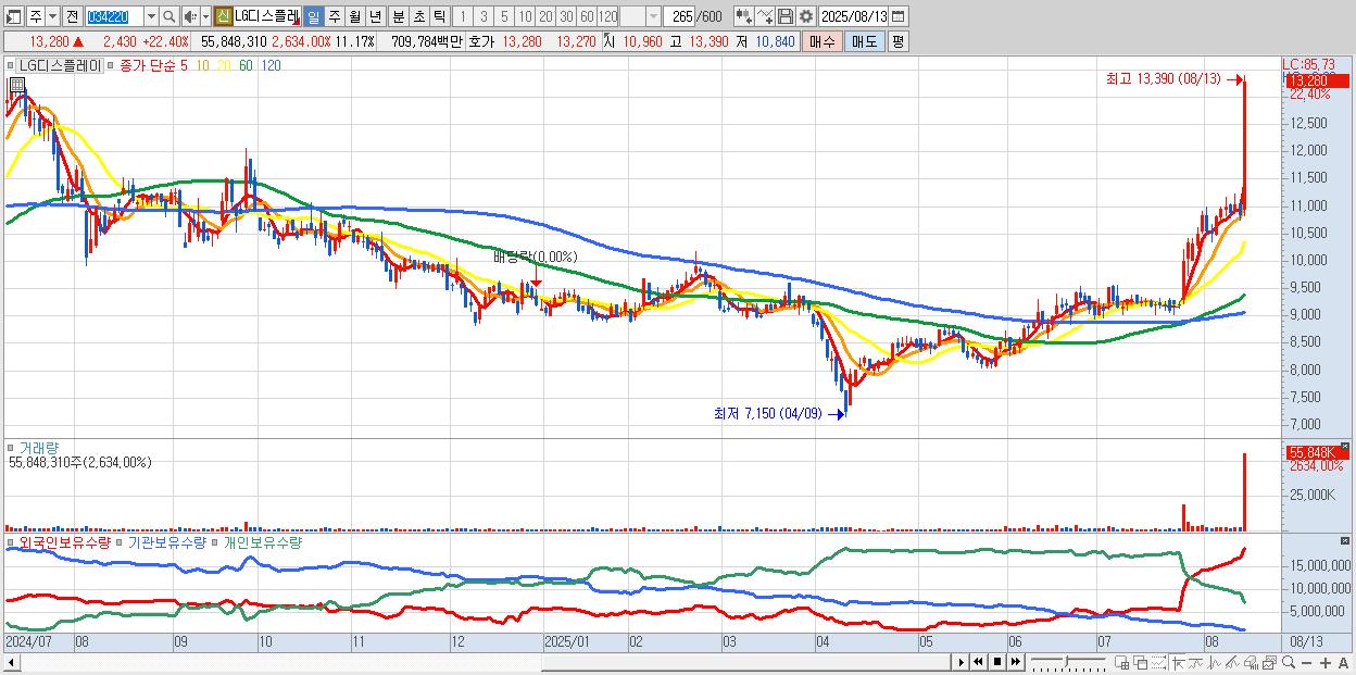 - LG디스플레이 (13,290원 ▲ 22.49% , 시총: 66,450억, 거래량: 32,040,448, 거래대금:4,052억)