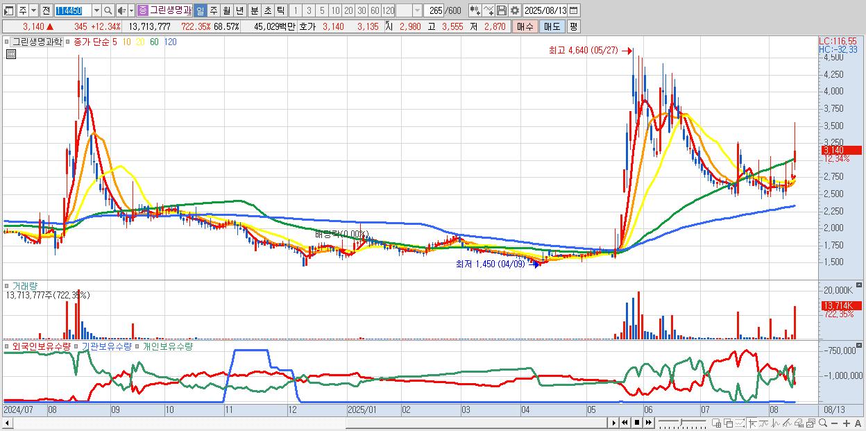 - 그린생명과학 (3,140원 ▲ 12.34% , 시총: 628억, 거래량: 13,713,777, 거래대금:450억)