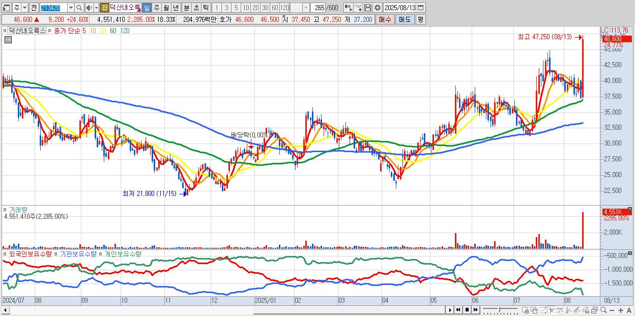 - 덕산네오룩스 (46,600원 ▲ 24.6% , 시총: 11,571억, 거래량: 2,749,276, 거래대금:1,236억)
