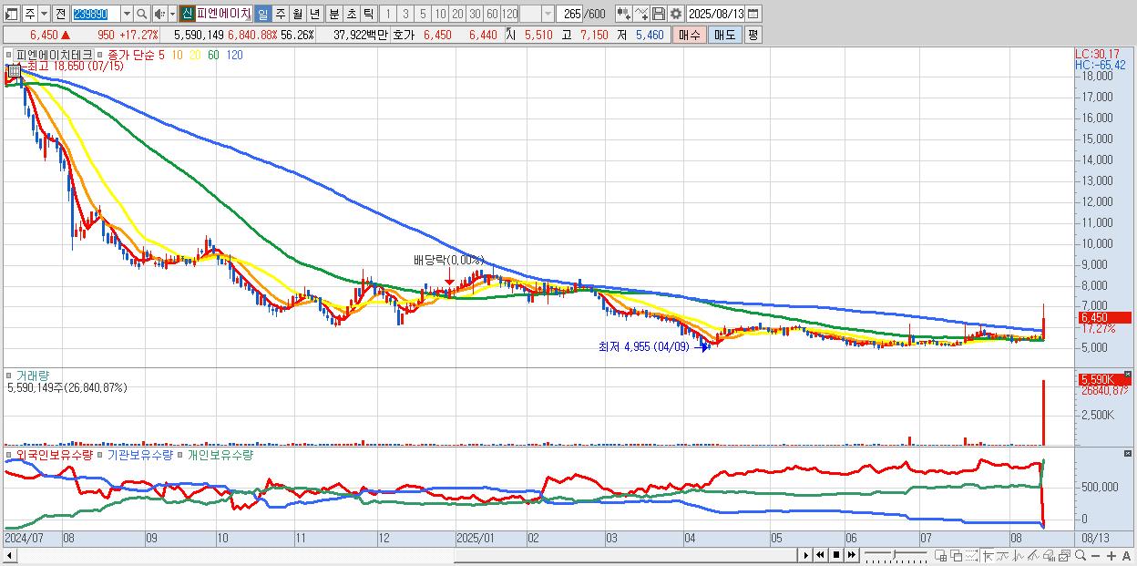 - 피엔에이치테크 (6,450원 ▲ 17.27% , 시총: 641억, 거래량: 5,590,149, 거래대금:379억)