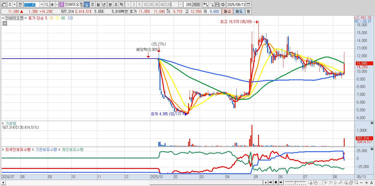 - 인바이오젠 (11,040원 ▲ 14.29% , 시총: 1,109억, 거래량: 507,314, 거래대금:58억)